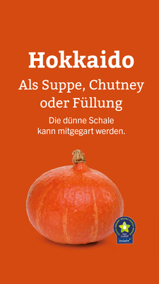 Der Hokkaido ist wahrscheinlich der bekannteste Kürbis und überzeugt mit seinem nussigen Geschmack und der Tatsache, dass er mit Schale gegessen werden kann. Sein festeres Fruchtfleisch macht ihn besonders vielseitig.