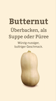 Der Butternutkürbis hat ein butterweiches, cremiges Fruchtfleisch und einen süßlich-nussigen Geschmack. Seine birnenartige Form und die dünne Schale machen ihn leicht zu verarbeiten.