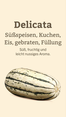 Der Delicata-Kürbis ist eine weniger bekannte Sorte, die durch ihr feines, süßes Aroma besticht. Die längliche Form und die dünne Schale machen ihn zu einem echten Hingucker in der Küche.