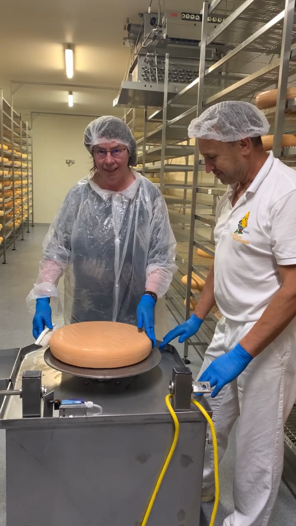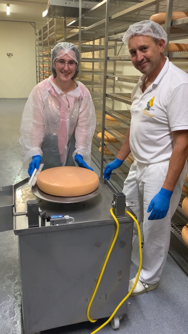 Und das war gar nicht so einfach: Der Käselaib wird hierfür auf eine sich drehende Metallplatte gelegt. Mit der linken Hand muss man den sich drehenden Käse in Position halten. Mit der anderen Hand hält man eine Bürste und verteilt eine dünne Schicht Salzwasser gleichmäßig über die Ränder und die restliche Oberfläche des Käses. Danach wird der Laib einmal gewendet und der Vorgang wiederholt. Besonders schwierig war es, den Käse in Position zu halten: Entweder wurde zu viel Druck ausgeübt und der Käse fiel fast von der Platte oder es wurde zu wenig Druck ausgeübt und der Käse wurde durch das Bürsten ebenfalls von der rotierenden Platte geschoben. Hier sind also viel Fingerspitzengefühl und Erfahrung gefragt.