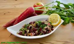 Inzwischen den Apfel waschen, ebenfalls grob raspeln und mit Zitronensaft beträufeln. Kidneybohnen in ein Sieb geben, waschen und abtropfen lassen. Bundzwiebeln in feine Ringe schneiden, mit Kidneybohnen und Apfel unter den Rettich mischen. Olivenöl hinzufügen und nach Geschmack mit Salz und Pfeffer würzen. Auf 4 Teller verteilen, mit gehackter Petersilie bestreuen und servieren.