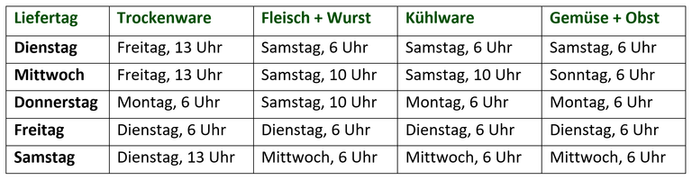 Diese Bestellfristen gelten für normale Wochen ohne Feiertage.