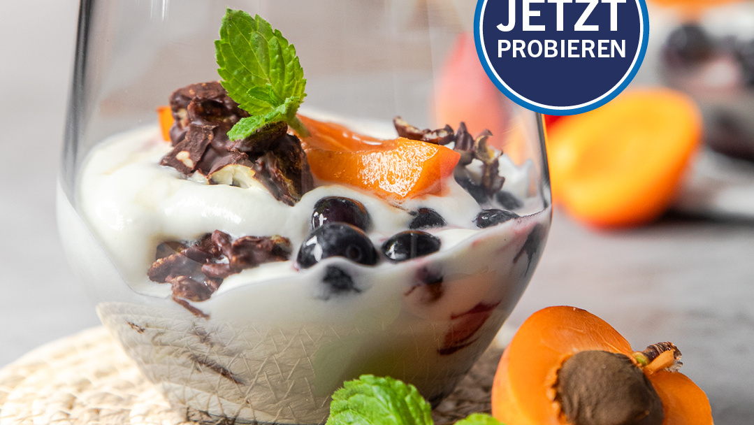 Heidelbeeren und Aprikosen mit der Joghurtsahne und den Schokocrossies in Gläsern schichten.