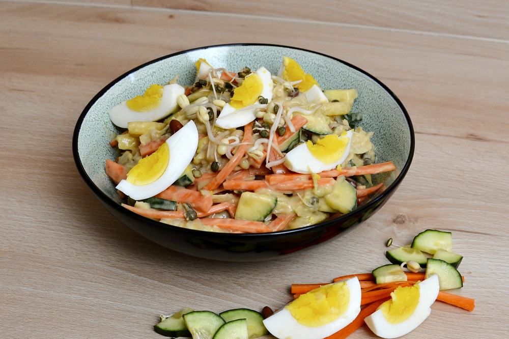 Den Chinakohl in fingerbreite Streifen schneiden und kurz in kochendem Salzwasser blanchieren. Danach sofort kalt abschrecken und gut abtropfen lassen. Die Sprossen ebenfalls ca. ½ Minute blanchieren, dann sind sie besser verdaulich. Kartoffeln schälen und in Scheiben schneiden. Eier schälen und vierteln. Die Möhren in feine Streifen schneiden oder grob raspeln. Die Salatgurke der Länge nach vierteln und in Scheiben schneiden. Das Gemüse gut miteinander in einer großen Schüssel vermischen und zur Seite stellen. Für das Dressing das Erdnussöl in einer Pfanne erhitzen und die Zwiebelwürfel bei niedriger Hitze anbraten. Knoblauch zufügen und ebenfalls anbräunen. Chiliflocken, Sojasauce und Erdnussmus ebenfalls zugeben, das Ganze mit Salz und Pfeffer würzen und so lange kochen, bis eine cremige Sauce entsteht. Eventuell etwas heißes Wasser nachgießen und nochmals nachwürzen. Salat mit dem Dressing übergießen, mit den Eierspalten garnieren und servieren.