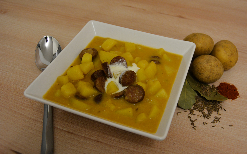 Mit Paprika und Kümmel würzen und mit 1 Liter Wasser aufgießen. Salz, Pfeffer und Lorbeerblätter dazu geben. Zugedeckt kochen lassen.