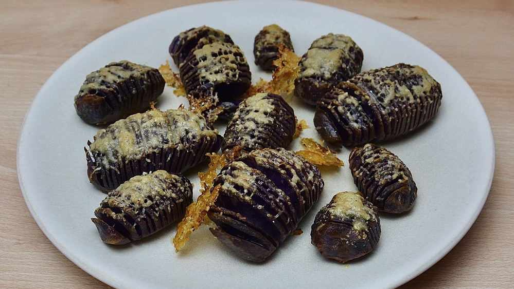 Blaue Fächerkartoffeln mit Parmesankruste