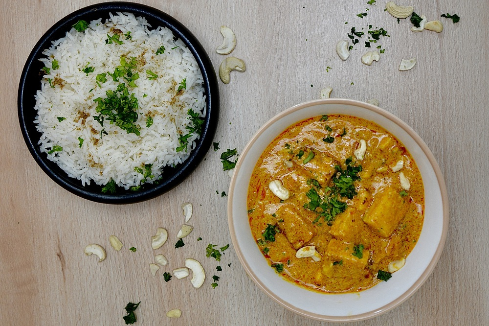 Tomaten in die Pfanne geben, kurz erhitzen. Currypaste Korma hinzufügen, Kokos-Cashew-Milch zufügen und aufkochen lassen. Mit Zitronensaft abschmecken, den gebratenen Paneer und die Cashews zufügen.