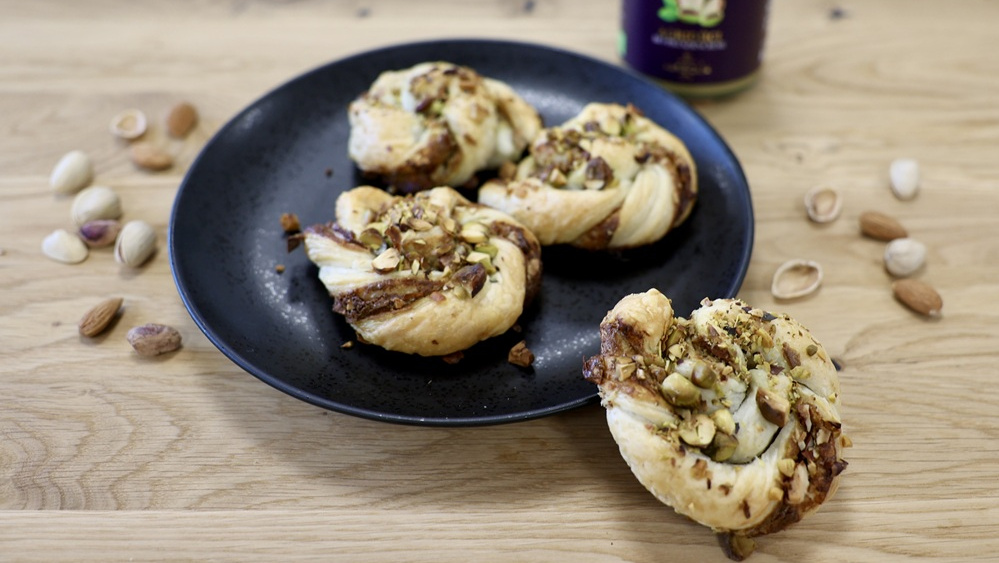 Das Ei verquirlen und die Knoten damit bestreichen, damit sie schön braun werden. Zum Schluss die Pistazien hacken und über die Knoten streuen.