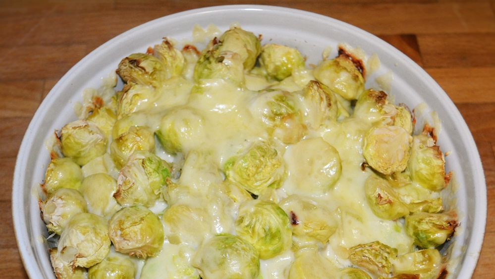 Rosenkohl putzen, waschen und je nach Größe der Röschen eventuell halbieren. In reichlich kochendem Salzwasser ca. 25 – 30 Minuten bissfest garen. Abgießen und in eine gefettete Auflaufform geben.