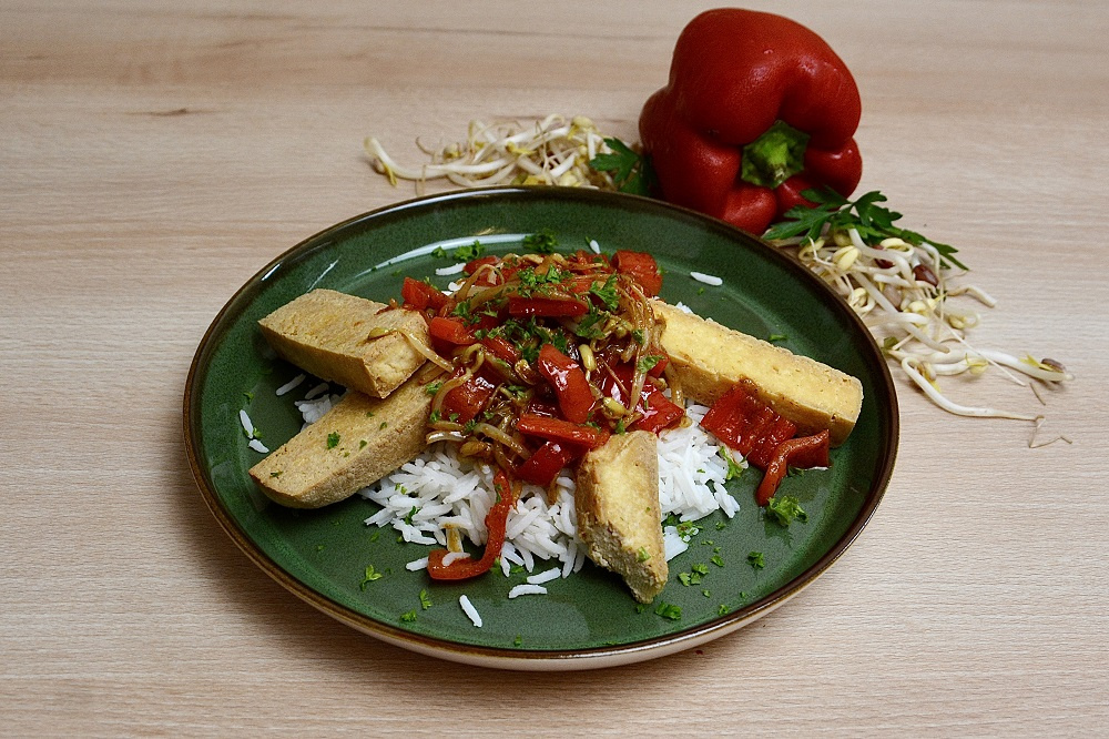 In einer zweiten Pfanne das restliche Öl bei mittlerer Hitze erwärmen, Currypaste zufügen und anbraten bis die Aromen sich entfalten. Paprikastücke und Sprossen zugeben, gut vermischen und 1 Minute weiterbraten.
