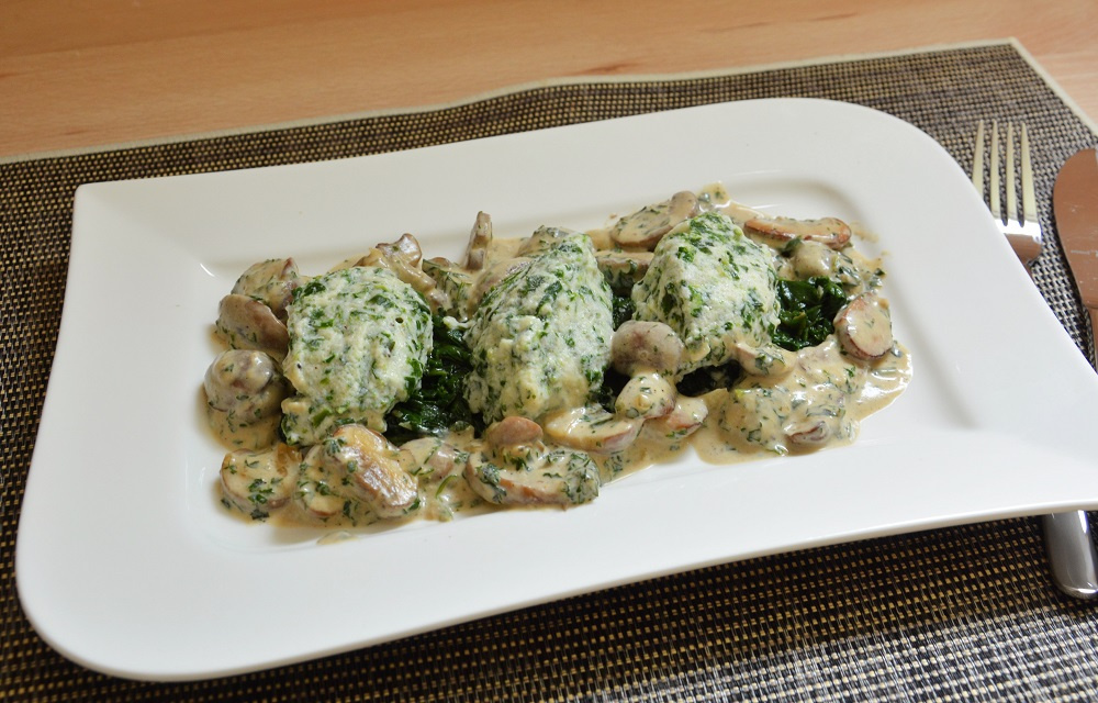Spinat-Ricotta-Knödel mit Champignonsauce