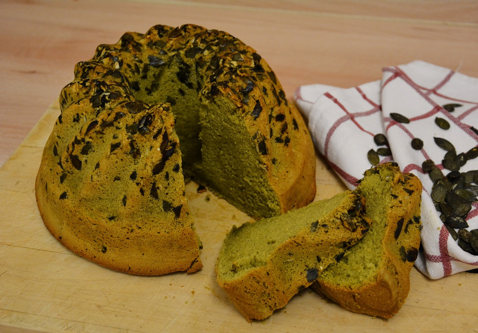 Die Gugelhupfform einfetten und mit gehackten Kürbiskernen auslegen. Die Teigmasse einfüllen.