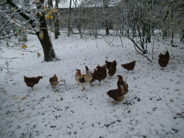 Hühner bewegen sich nur sehr ungern in die weite Welt hinaus, da sie (zu Recht!) immer Angst vor Raubvögeln haben. Birgit Girschick versucht dem auf zwei Arten entgegenzuwirken: Ein Teil des Auslaufs befindet sich zwischen Bäumen und Sträuchern, die den Hennen Schutz vor Raubvögeln bieten. In jeder Gruppe Hennen befindet sich auch ein Hahn, der Raubvögel fernhält. Mit dem Erfolg, dass die Hennen sich sehr viel besser auf der Wiese verteilen und sich weiter weg vom Stall trauen.