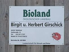 Der Hof der Familie Girschick liegt in Mühltal-Frankenhausen, inmitten der bewaldeten Hügellandschaft des vorderen Odenwalds. Die Girschicks betreiben ihren „Hof auf der Höhe“ seit 1991. Es ist ein reiner Familienbetrieb mit mittlerweile 42 Hektar, überwiegend Grünland mit ca. 10 Highland-Mutterkühen mit Nachwuchs, ca. 750 Masthähnchen und ca. 2200 Legehennen. Seit 2004 gehören sie dem Bioland-Landesverband an.