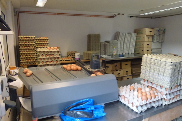 Für die hervorragende Qualität der Eier wichtig ist auch die sorgfältige Sortierung und Verpackung. Die Eier werden mit einer kleinen Sortiermaschine in Handarbeit nach Gewicht und Qualität sortiert und anschließend schonend transportiert.